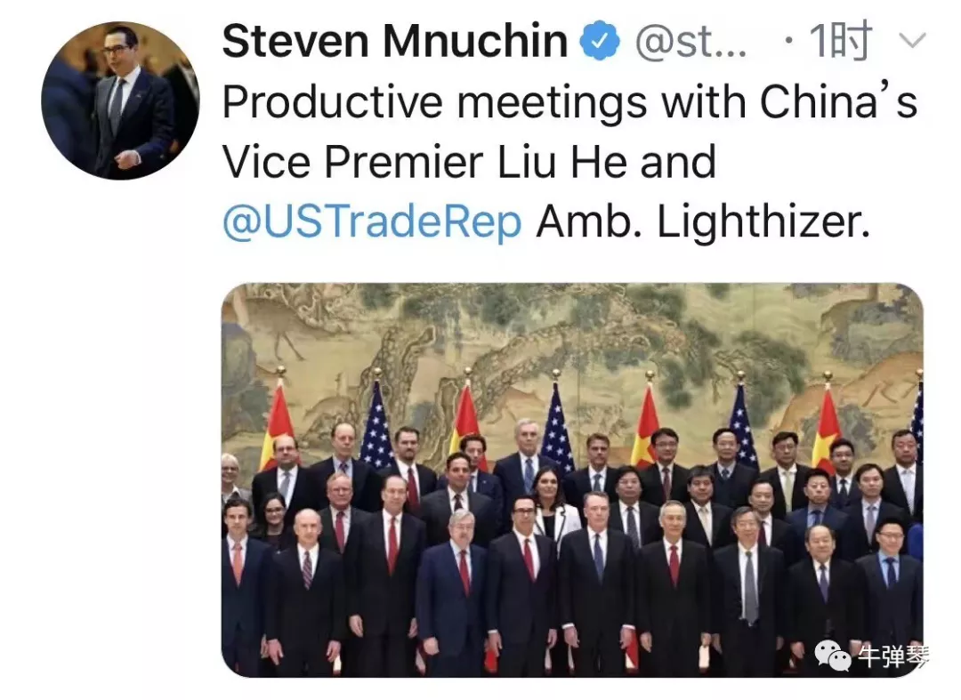 很有意思的,這次磋商一結(jié)束,美國(guó)財(cái)長(zhǎng)姆努欽立刻發(fā)了一條推特,上面寫(xiě)道:和劉鶴副總理、萊特希澤大使進(jìn)行了富有建設(shè)性的會(huì)議。