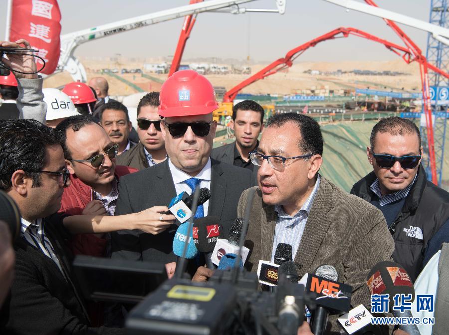 2月25日,在埃及開(kāi)羅以東約50公里處的新首都中央商務(wù)區(qū),埃及總理穆斯塔法·馬德布利(右二)接受媒體采訪。 埃及總理穆斯塔法·馬德布利25日上午視察了由中國(guó)建筑股份有限公司承建的埃及新首都中央商務(wù)區(qū),并見(jiàn)證了標(biāo)志塔主樓1.85萬(wàn)立方米超大型混凝土基礎(chǔ)底板開(kāi)盤澆筑。埃及新行政首都中央商務(wù)區(qū)位于首都開(kāi)羅以東約50公里處,總占地面積約50.5萬(wàn)平方米,包含20個(gè)高層建筑單體及配套市政工程。 新華社記者鄔惠我攝