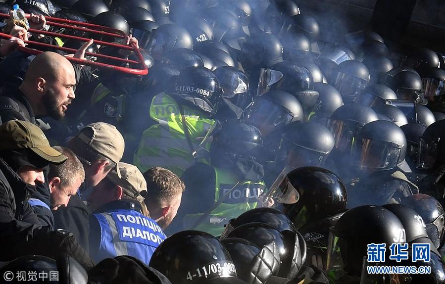 當(dāng)?shù)貢r(shí)間2019年3月9日,烏克蘭基輔,烏克蘭民族主義政黨的激進(jìn)分子集會要求調(diào)查烏克蘭武裝部隊(duì)官員的腐敗問題,與警方發(fā)生激烈沖突。(圖片來源:視覺中國)