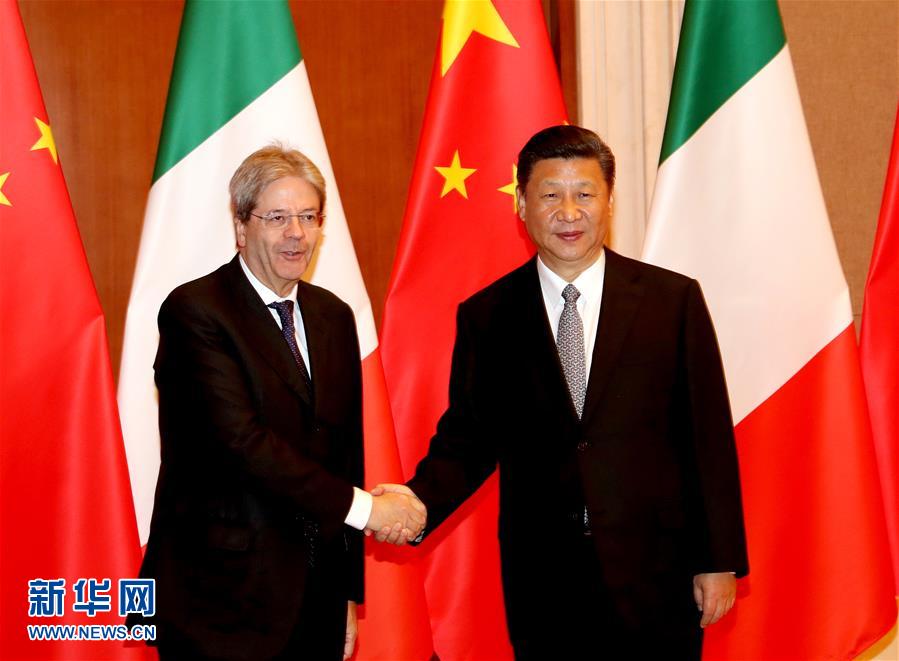 2017年5月16日,習(xí)近平在北京釣魚(yú)臺(tái)國(guó)賓館會(huì)見(jiàn)來(lái)華出席“一帶一路”國(guó)際合作高峰論壇的時(shí)任意大利總理真蒂洛尼。(新華社記者劉衛(wèi)兵攝)