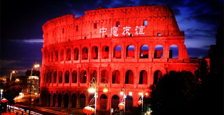 彩燈照耀下,古羅馬斗獸場(chǎng)上“中意友誼”四個(gè)漢字格外耀眼。