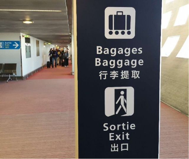 戴高樂國(guó)際機(jī)場(chǎng)內(nèi)的中文提示語。新華社記者 孫浩 攝