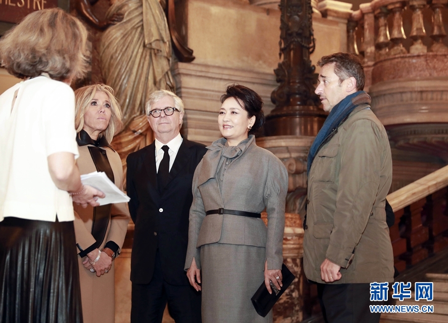當(dāng)?shù)貢r(shí)間3月25日,國(guó)家主席習(xí)近平夫人彭麗媛在法國(guó)總統(tǒng)夫人布麗吉特陪同下參觀位于巴黎市第九區(qū)的法國(guó)巴黎歌劇院。新華社記者 丁林 攝
