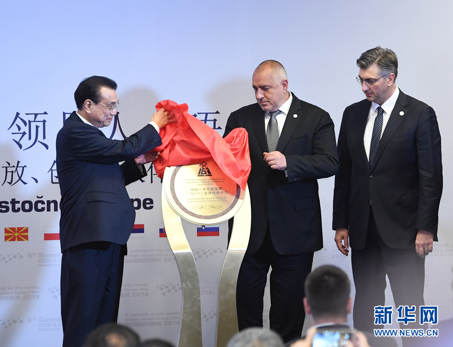 當?shù)貢r間4月12日下午,國務(wù)院總理李克強在杜布羅夫尼克出席第八次中國-中東歐國家領(lǐng)導(dǎo)人會晤后,與保加利亞總理鮑里索夫、克羅地亞總理普連科維奇共同為“16+1全球伙伴中心”揭牌,宣布“16+1全球伙伴中心”正式成立。新華社記者 申宏 攝