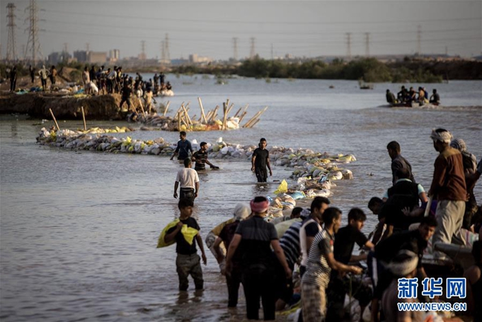 4月11日,在伊朗阿瓦士附近,人們?cè)诖罱ǚ篮榈獭=?,伊朗境?nèi)持續(xù)洪澇災(zāi)害。新華社發(fā)(艾哈邁德·哈拉比薩斯 攝)