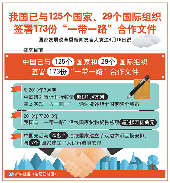 新華社北京4月18日電(記者 王雨蕭、安蓓)國(guó)家發(fā)展改革委新聞發(fā)言人袁達(dá)18日說(shuō),截至目前,中國(guó)已與125個(gè)國(guó)家和29個(gè)國(guó)際組織簽署173份“一帶一路”合作文件。