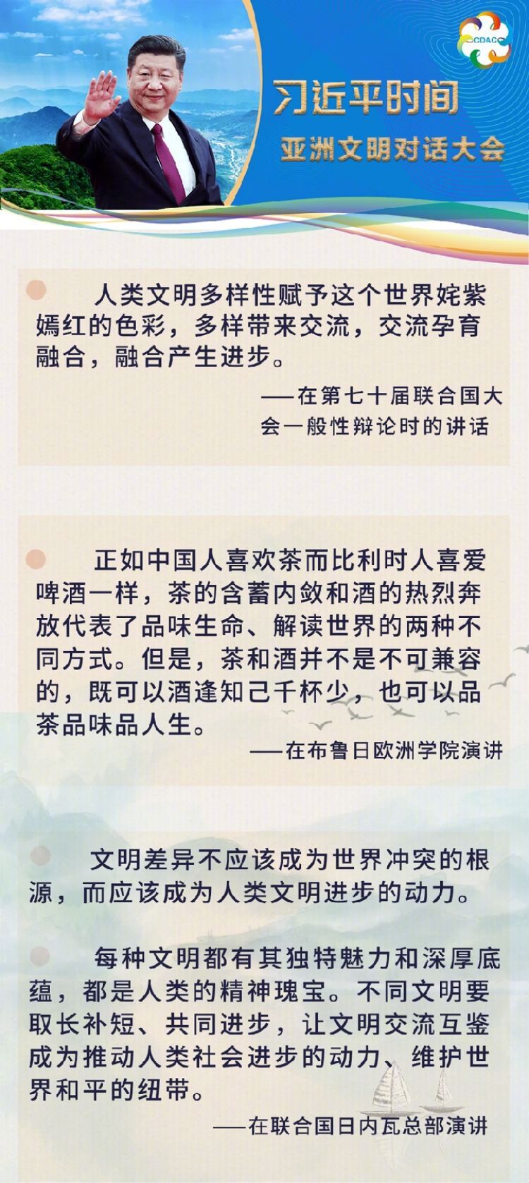 “在漫長(zhǎng)歷史長(zhǎng)河中,如亞洲的黃河和長(zhǎng)江流域、印度河和恒河流域、幼發(fā)拉底河和底格里斯河流域以及東南亞等地區(qū)孕育了眾多古老文明,彼此交相輝映、相得益彰,為人類文明進(jìn)步作出了重要貢獻(xiàn)。今天的亞洲,多樣性的特點(diǎn)仍十分突出,不同文明、不同民族、不同宗教匯聚交融,共同組成多彩多姿的亞洲大家庭?!?/p>