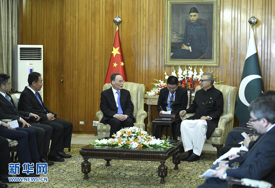 會見阿爾維時,王岐山表示,中巴是“鐵桿”朋友。建交68年來,無論國際風云如何變幻,兩國始終在涉及彼此核心利益問題上相互尊重、相互支持,結下了最真誠的友誼。近年來,中巴關系發(fā)展勢頭良好,雙方政治互信進一步增強,務實合作不斷深化,人文交往更加活躍。中巴經(jīng)濟走廊建設取得實實在在的成果,已成為新時期中巴友好合作的重要標志。我這次訪巴,就是再次向兩國人民和世界發(fā)出中巴是全天候戰(zhàn)略合作伙伴的訊號。中方愿同巴方加強各領域、各層次、全方位合作,讓中巴友好更好地惠及兩國和兩國人民,打造新時代更緊密的中巴命運共同體。