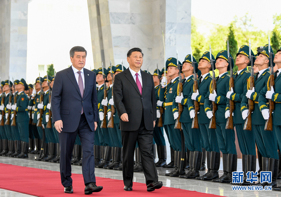 習(xí)近平乘車抵達(dá)廣場(chǎng)時(shí),受到熱恩別科夫熱情迎接。兩國元首登上檢閱臺(tái)。軍樂團(tuán)奏中吉兩國國歌。兩國元首檢閱儀仗隊(duì)。習(xí)近平行至儀仗隊(duì)中央,用吉爾吉斯語向儀仗隊(duì)員問候:戰(zhàn)士們好!儀仗隊(duì)員用吉爾吉斯語回答:歡迎您!習(xí)近平同熱恩別科夫共同觀看了分列式。