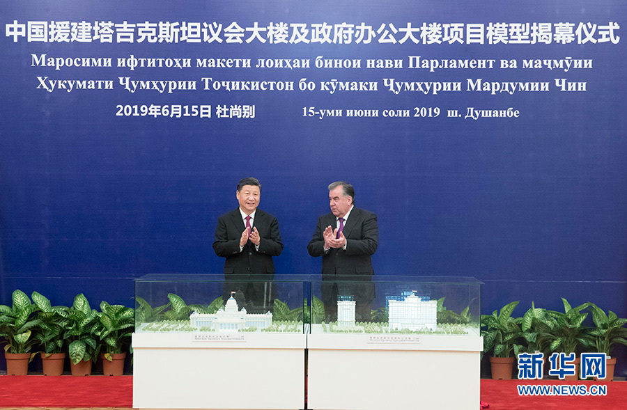 6月15日,國家主席習近平在杜尚別同塔吉克斯坦總統(tǒng)拉赫蒙會談。會談后,兩國元首共同出席中方援塔議會大樓、政府辦公大樓項目模型揭幕儀式。 新華社記者 王曄 攝