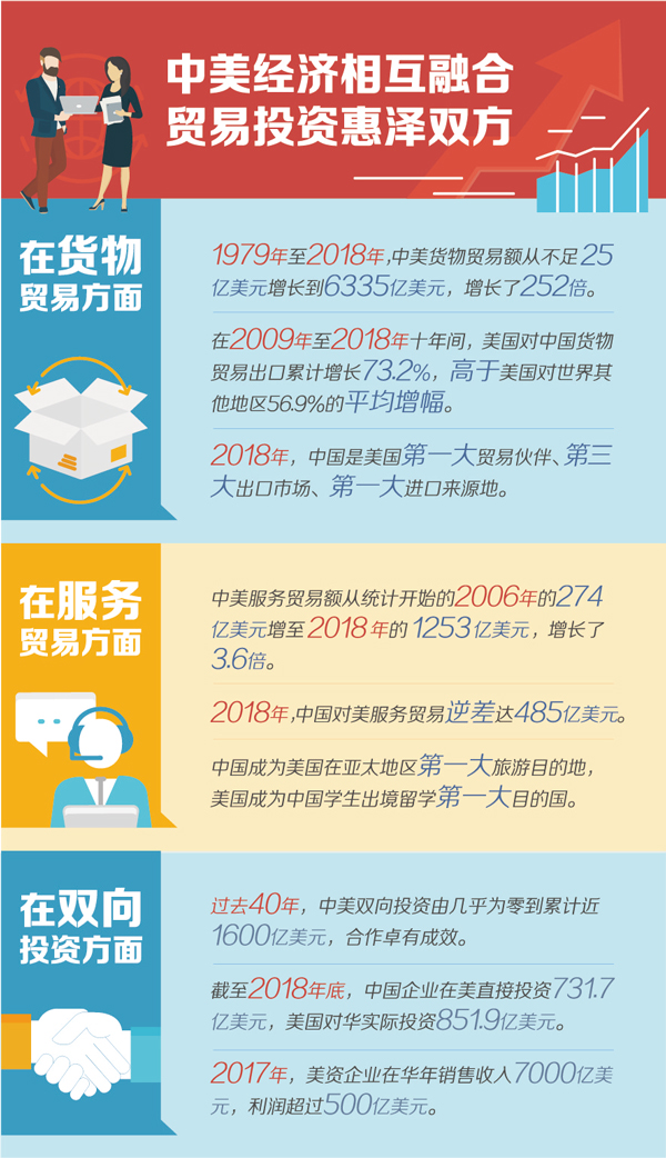 在國際經(jīng)濟(jì)合作中,正常的貿(mào)易關(guān)系是建立在等價交換基礎(chǔ)上的互惠互利關(guān)系,而不是你多我少、你輸我贏的“零和博弈”。國際貿(mào)易有利于推動資源在世界范圍內(nèi)優(yōu)化配置,促進(jìn)各國經(jīng)濟(jì)共同發(fā)展,推動人類社會共同進(jìn)步,國際貿(mào)易的歷史早已證明這樣的實踐是有效的,實踐經(jīng)驗也早已成為國際經(jīng)濟(jì)學(xué)的基本原理,中美經(jīng)貿(mào)合作的事實也作了同樣的驗證。中美建交以來,在雙邊貿(mào)易方面,1979年至2018年,雙邊貨物貿(mào)易額從不足25億美元增長到6335億美元,增長了252倍;在雙向投資領(lǐng)域,過去40年,中美雙向投資由幾乎為零到累計近1600億美元,中美互為對方重要投資伙伴,投資的雙向性和互惠性進(jìn)一步顯現(xiàn)。中美經(jīng)貿(mào)關(guān)系發(fā)展的歷程證明,中美通過優(yōu)勢互補、互通有無,有力促進(jìn)了各自經(jīng)濟(jì)發(fā)展和產(chǎn)業(yè)結(jié)構(gòu)優(yōu)化升級,雙方經(jīng)貿(mào)往來是惠澤彼此的關(guān)系,而非中國讓美國“吃虧”的過程。