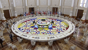 15日上午,杜尚別納烏魯茲宮,習(xí)主席出席亞洲相互協(xié)作與信任措施會議第五次峰會。圓桌會議開始后,亞信主席國元首拉赫蒙總統(tǒng)邀請習(xí)主席第一個(gè)發(fā)言。