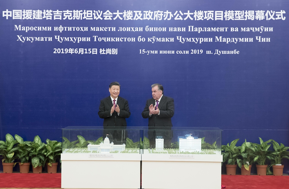 6月15日,國家主席習(xí)近平在杜尚別同塔吉克斯坦總統(tǒng)拉赫蒙會談。會談后,兩國元首共同出席中方援塔議會大樓、政府辦公大樓項(xiàng)目模型揭幕儀式。新華社記者 王曄 攝