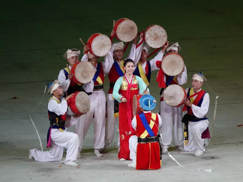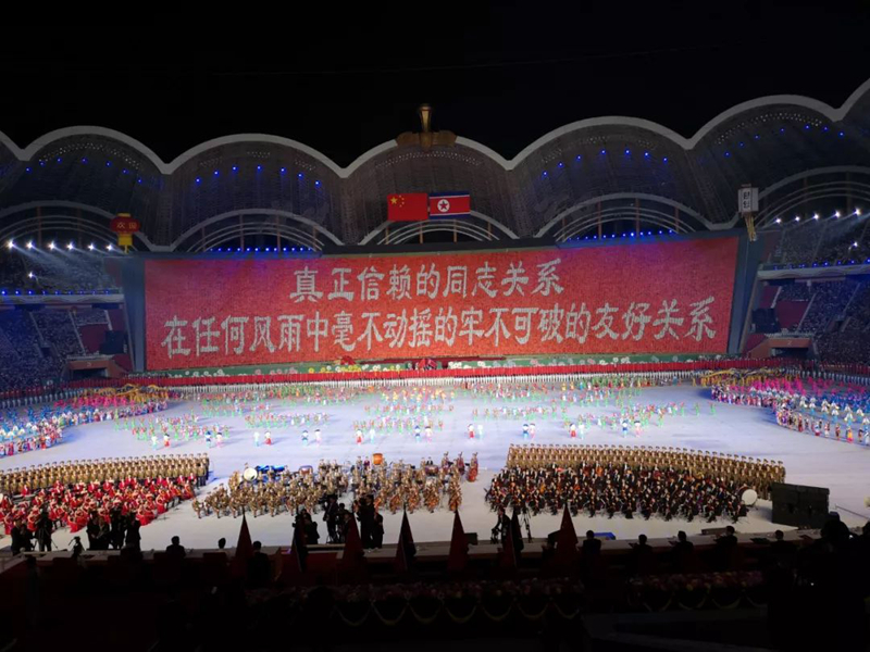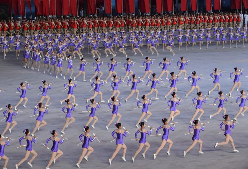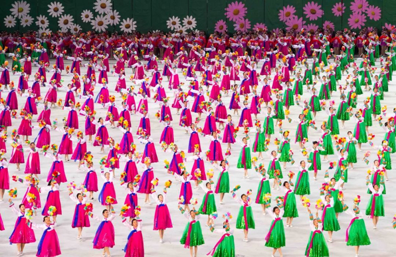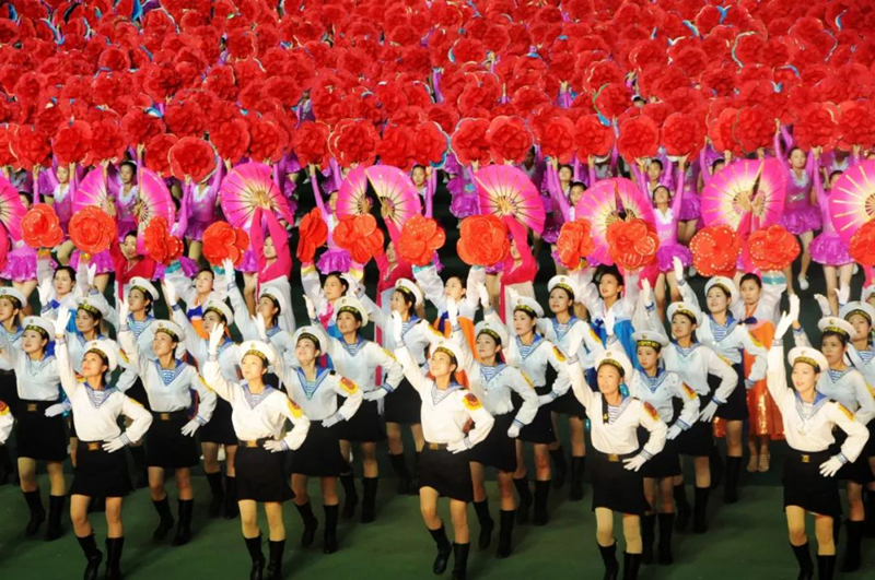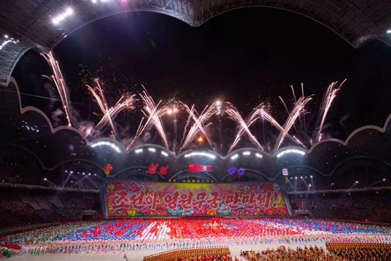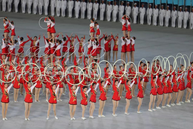 平壤大同江畔,綾羅島“五一”體育場是團體操的主要舞臺。演出以朝鮮民族獨特的“歌舞之美”、富有活力的團體操、嘆為觀止的雜技表演,展現(xiàn)出朝鮮革命與戰(zhàn)爭、政治和軍隊建設(shè)、民生與經(jīng)濟發(fā)展以及對外交往的宏偉畫卷。