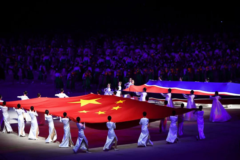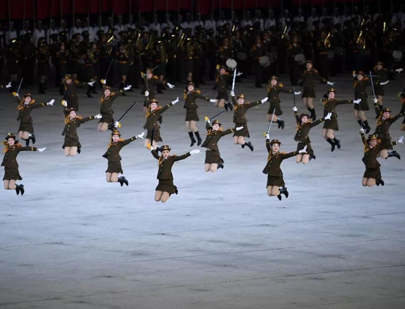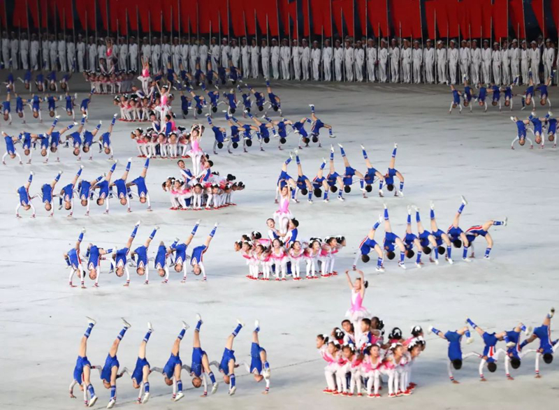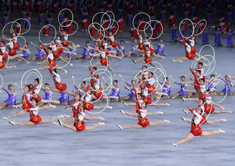 ▲2018年9月9日,演員在平壤綾羅島“五一”體育場表演“輝煌的祖國”。新華社記者邢廣利攝
