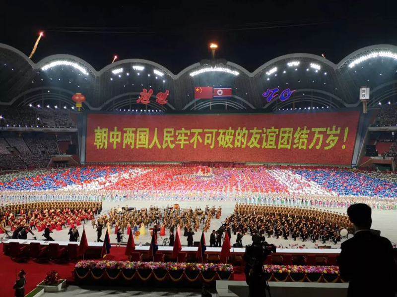 演出在以“朝中友誼萬古長青”為主題的大型歌舞表演中結(jié)束。習近平和金正恩同全場觀眾一起站立,為藝術(shù)家和演員們的精湛表演送上經(jīng)久不息的掌聲。