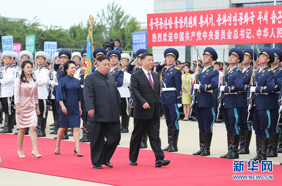 6月21日,中共中央總書記、國家主席習近平結(jié)束對朝鮮的國事訪問離開平壤回國。離開前,習近平和夫人彭麗媛出席朝鮮勞動黨委員長、國務委員會委員長金正恩和夫人李雪主在機場舉行的歡送儀式。新華社記者 鞠鵬 攝