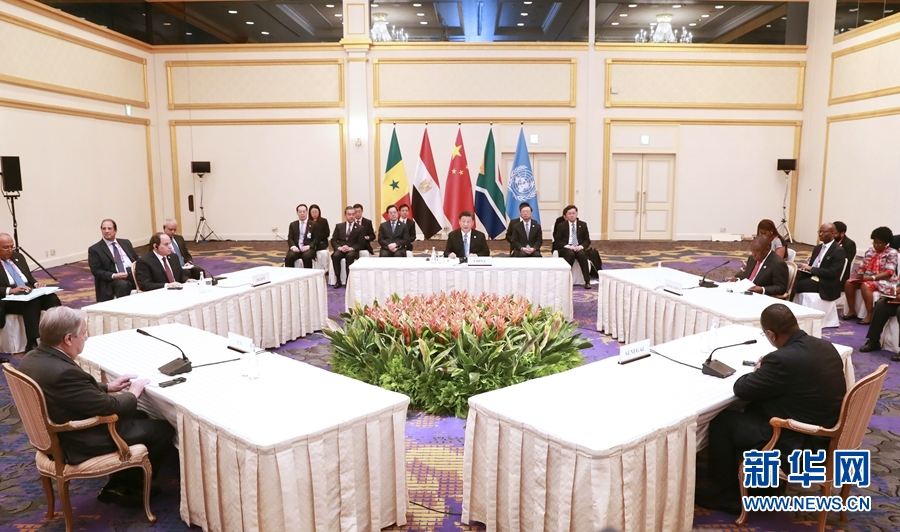 6月28日,國家主席習(xí)近平在大阪主持中非領(lǐng)導(dǎo)人會(huì)晤。中非合作論壇前任非方共同主席國南非總統(tǒng)拉馬福薩、非洲聯(lián)盟輪值主席國埃及總統(tǒng)塞西、中非合作論壇現(xiàn)任非方共同主席國塞內(nèi)加爾總統(tǒng)薩勒和聯(lián)合國秘書長古特雷斯出席。 新華社記者 龐興雷 攝