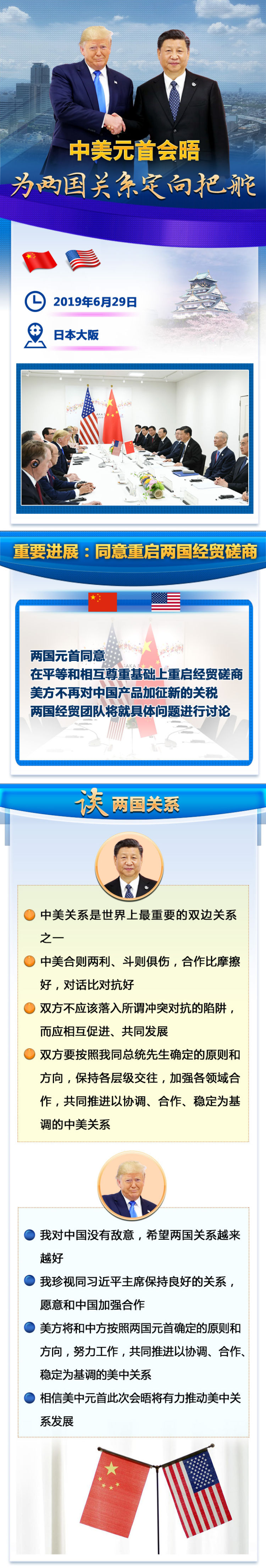 舉世矚目的中美元首會(huì)晤,于6月29日在日本大阪舉行。國(guó)家主席習(xí)近平同美國(guó)總統(tǒng)特朗普就事關(guān)中美關(guān)系發(fā)展的根本性問(wèn)題、當(dāng)前中美經(jīng)貿(mào)摩擦以及共同關(guān)心的國(guó)際和地區(qū)問(wèn)題深入交換意見(jiàn),為下階段兩國(guó)關(guān)系發(fā)展定向把舵,同意推進(jìn)以協(xié)調(diào)、合作、穩(wěn)定為基調(diào)的中美關(guān)系。