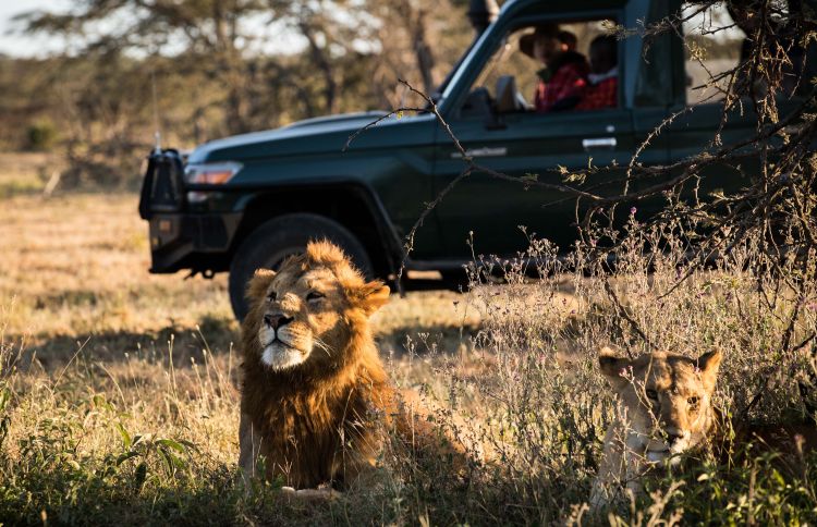 2018年7月7日,在肯尼亞馬賽馬拉大草原奧肯耶保護區(qū),星巴和當?shù)匮策墕T觀察獅群情況。新華社記者呂帥攝