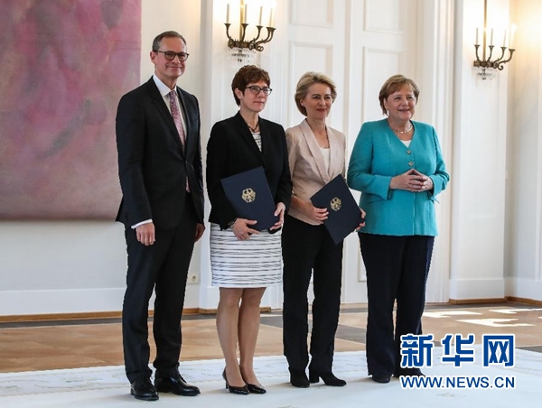 7月17日,在德國首都柏林的總統(tǒng)府,(從右至左)德國總理默克爾、馮德萊恩、克蘭普-卡倫鮑爾以及聯(lián)邦參議院第一副議長米歇爾·穆勒在儀式后合影。新華社記者單宇琦攝