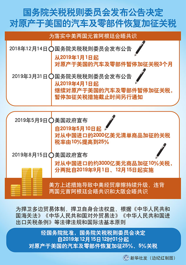 為捍衛(wèi)多邊貿(mào)易體制,捍衛(wèi)自身合法權(quán)益,根據(jù)《中華人民共和國(guó)海關(guān)法》《中華人民共和國(guó)對(duì)外貿(mào)易法》《中華人民共和國(guó)進(jìn)出口關(guān)稅條例》等法律法規(guī)和國(guó)際法基本原則,經(jīng)國(guó)務(wù)院批準(zhǔn),國(guó)務(wù)院關(guān)稅稅則委員會(huì)決定,自2019年12月15日12時(shí)01分起,對(duì)原產(chǎn)于美國(guó)的汽車及零部件恢復(fù)加征25%、5%關(guān)稅。