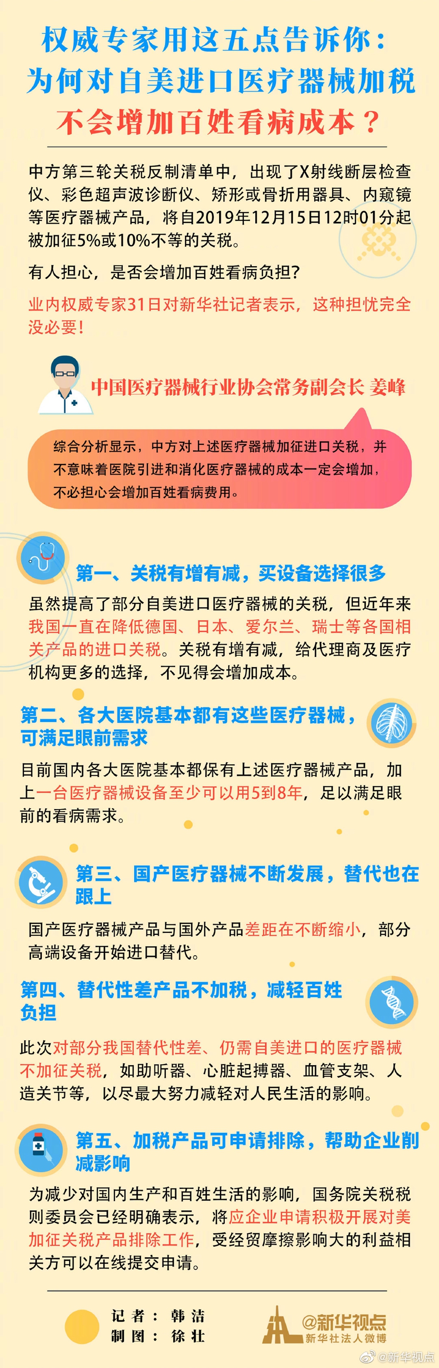 對此,中國醫(yī)療器械行業(yè)協(xié)會常務(wù)副會長姜峰31日接受記者采訪時說,綜合分析顯示,中方對上述醫(yī)療器械加征進口關(guān)稅,并不意味著醫(yī)院引進和消化醫(yī)療器械的成本一定會增加,不必擔(dān)心會增加百姓看病費用。