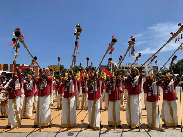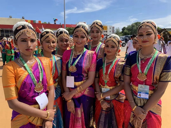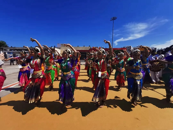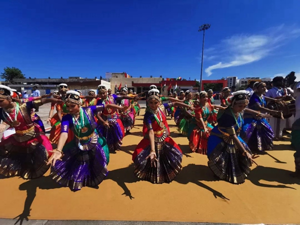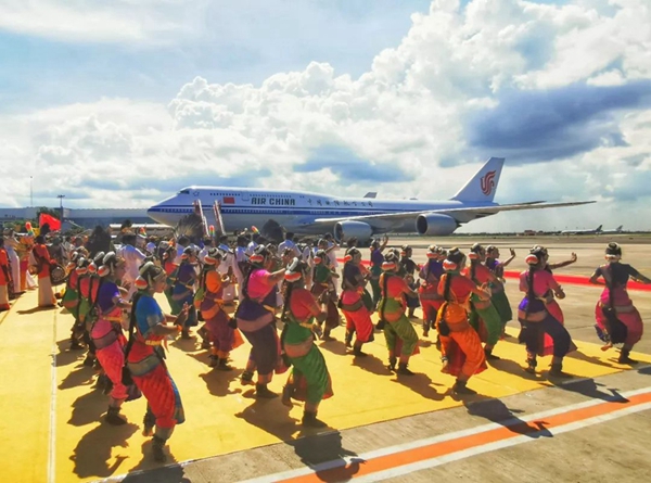 民眾們載歌載舞,有人跳起婆羅多舞,有人踩高蹺、劃旱船,盛情歡迎習(xí)主席的到來。