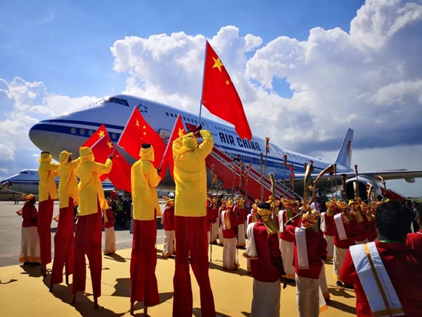 金奈國際機(jī)場(chǎng)內(nèi),鮮花紅毯相襯,當(dāng)?shù)孛癖娕懦刹煌年嚵?,等候?xí)主席的到來。