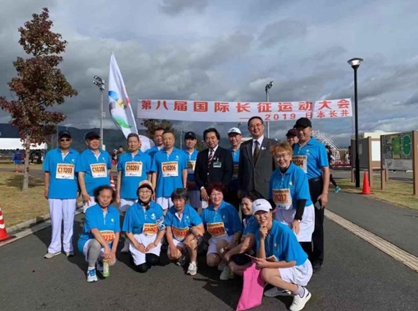 日本長井市市長內谷重治、副市長平進介、國際長征運動會創(chuàng)始人杜地以及部分運動員在比賽現場合影。(圖片由國際長征運動會委員會提供)