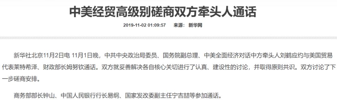 在充滿“變”的世界中,中美經(jīng)貿磋商進程也在發(fā)生著變化。11月1日晚,中美經(jīng)貿高級別磋商雙方牽頭人通了電話。
