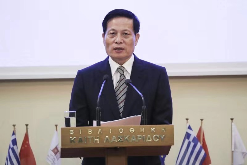 中國駐希臘大使章啟月在研討會上致辭。