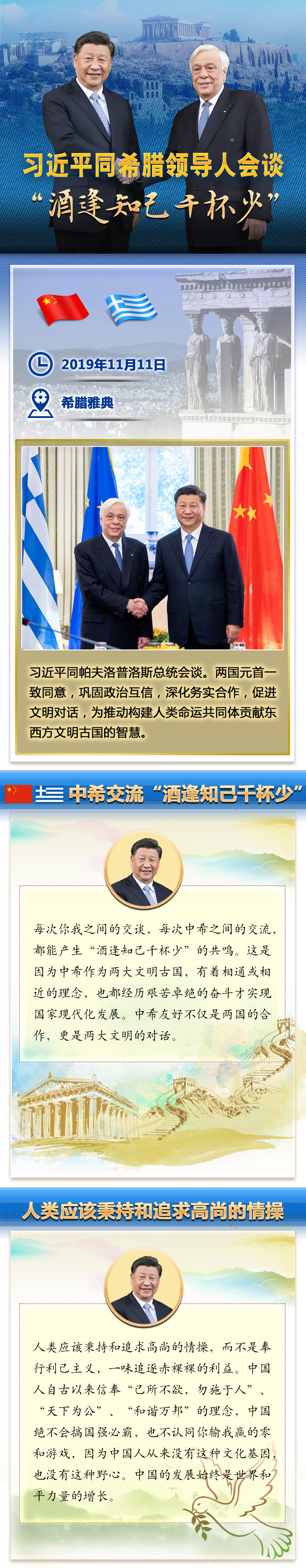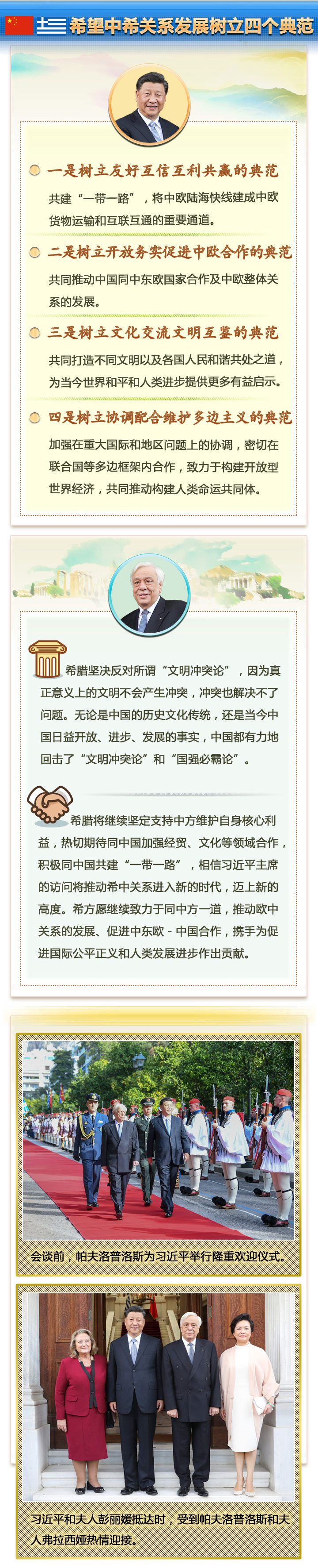 新華社雅典11月12日電 國家主席習(xí)近平11月10日晚抵達(dá)雅典,開始對(duì)希臘進(jìn)行國事訪問。11日上午,習(xí)主席的訪問活動(dòng)異常密集:向希臘無名戰(zhàn)士紀(jì)念碑獻(xiàn)花圈,出席希臘總統(tǒng)帕夫洛普洛斯舉行的隆重歡迎儀式并同帕夫洛普洛斯舉行會(huì)談,旋即又同總理米佐塔基斯舉行會(huì)談、出席合作文本交換儀式、共同會(huì)見記者。中希兩國領(lǐng)導(dǎo)人就雙邊關(guān)系及共同關(guān)心的國際和地區(qū)問題深入交換意見,達(dá)成廣泛共識(shí)。