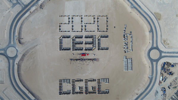 當(dāng)天上午,在主題為“攜手共建‘一帶一路’,奔跑筑夢(mèng)精彩未來(lái)”的長(zhǎng)跑活動(dòng)開(kāi)幕式現(xiàn)場(chǎng),由240多輛卡車(chē)、挖掘機(jī)、平地機(jī)等車(chē)輛設(shè)備擺出的2020、CEEC(中國(guó)能建英文縮寫(xiě))、CGGC(葛洲壩集團(tuán)英文縮寫(xiě))字樣排布在沙漠上,氣勢(shì)壯觀。