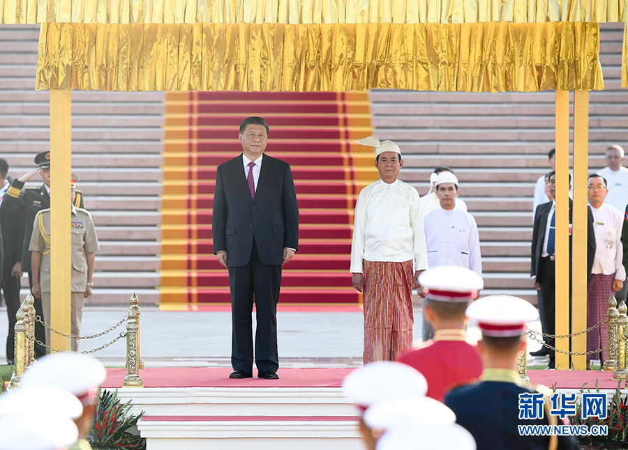 當(dāng)?shù)貢r(shí)間1月17日下午,國(guó)家主席習(xí)近平在內(nèi)比都總統(tǒng)府出席緬甸總統(tǒng)溫敏舉行的隆重歡迎儀式。 新華社記者 申宏 攝