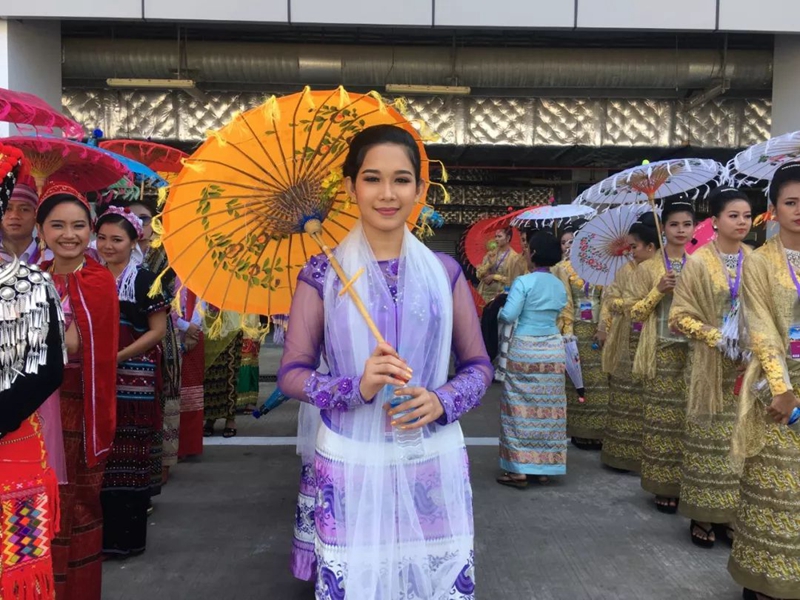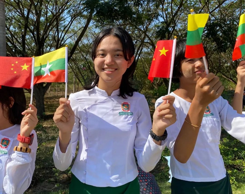 暖陽(yáng)下,中緬兩國(guó)國(guó)旗招展。