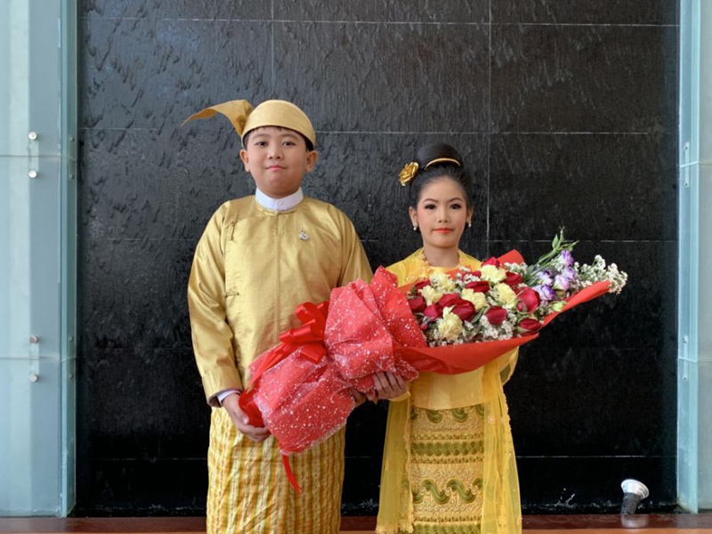 一對(duì)緬甸兒童身著最隆重的金色民族服飾,