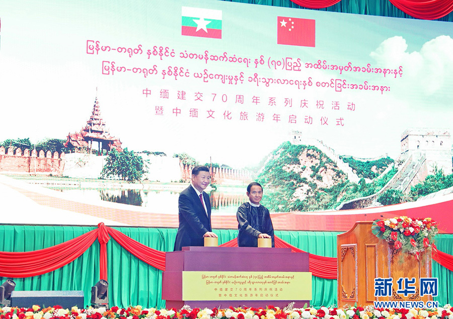 當(dāng)?shù)貢r(shí)間1月17日晚,國(guó)家主席習(xí)近平在內(nèi)比都第二國(guó)際會(huì)議中心出席中緬建交70周年慶?;顒?dòng)暨中緬文化旅游年啟動(dòng)儀式。這是習(xí)近平和緬甸總統(tǒng)溫敏共同按下按鈕,正式啟動(dòng)中緬文化旅游年。 新華社記者 黃敬文 攝