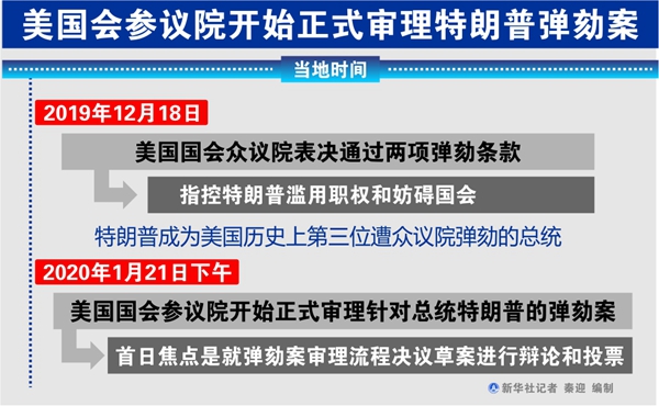 美國(guó)國(guó)會(huì)參議院21日下午開始正式審理針對(duì)總統(tǒng)特朗普的彈劾案,首日焦點(diǎn)是就彈劾案審理流程決議草案進(jìn)行辯論和投票。