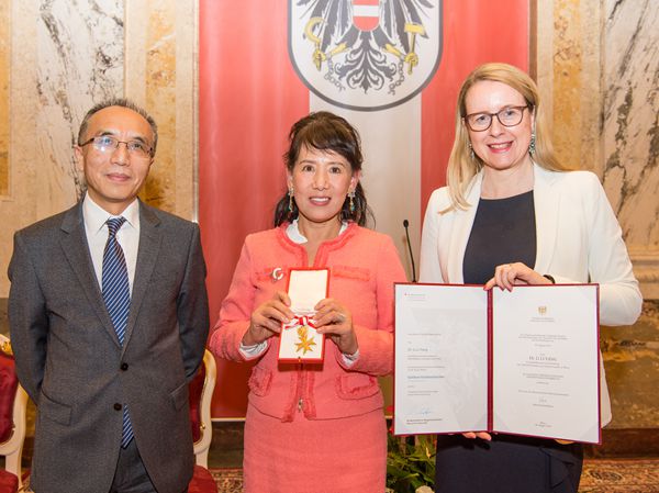 楊麗博士是2002年來第一位獲此殊榮的華人,也是獲得此項勛章的第一位華人女性。奧地利經(jīng)濟部長瑪加麗特·施拉姆伯克親自向她頒發(fā)勛章和榮譽證書。中國駐奧地利大使李曉駟出席頒獎儀式。
