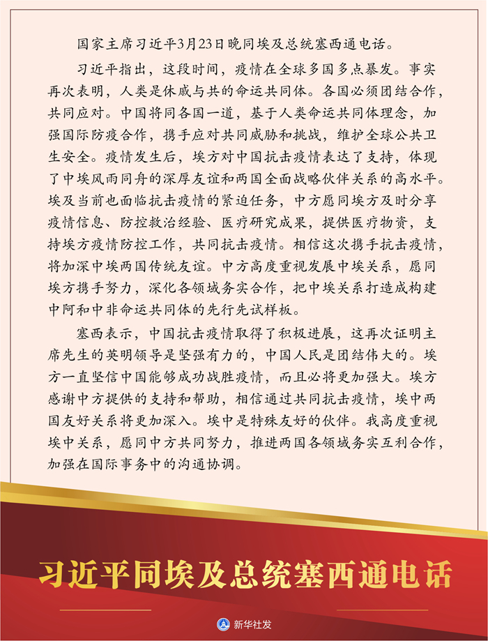 新華社北京3月23日電? 國家主席習近平23日晚同埃及總統(tǒng)塞西通電話。