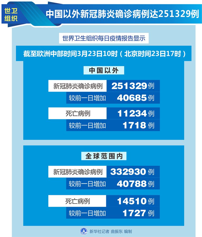 世衛(wèi)組織每日疫情報(bào)告顯示,截至歐洲中部時(shí)間23日10時(shí)(北京時(shí)間23日17時(shí)),中國(guó)以外新冠肺炎確診病例較前一日增加40685例,達(dá)到251329例;中國(guó)以外死亡病例較前一日增加1718例,達(dá)到11234例。