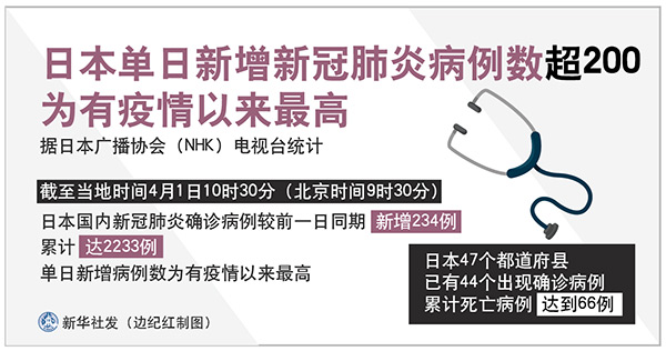 新華社東京4月1日電(記者華義)據(jù)日本廣播協(xié)會(NHK)電視臺統(tǒng)計,截至當(dāng)?shù)貢r間4月1日10時30分(北京時間9時30分),日本國內(nèi)新冠肺炎確診病例較前一日同期新增234例,累計達(dá)2233例;單日新增病例數(shù)為有疫情以來最高。