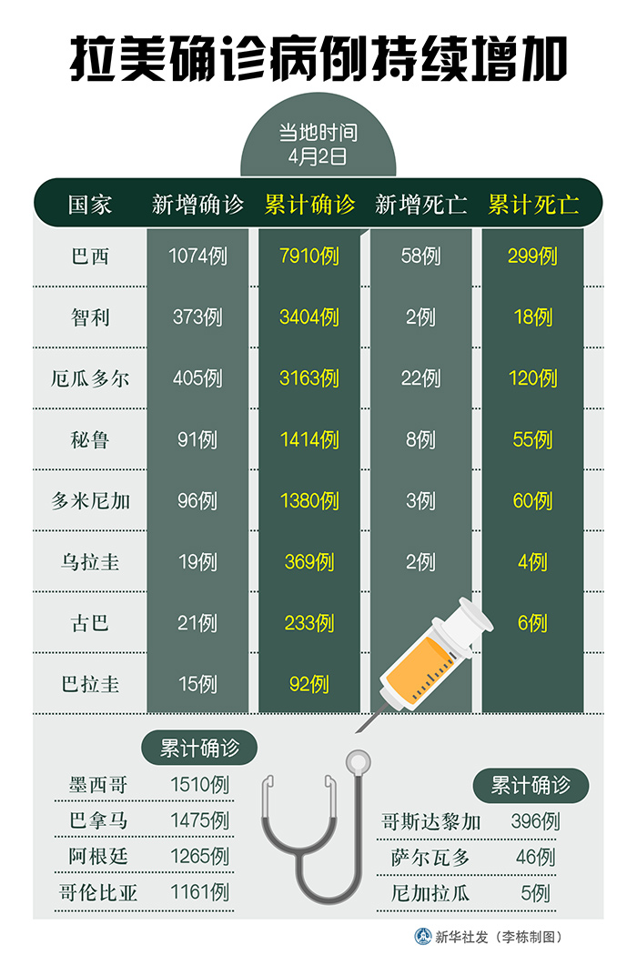 新華社圣保羅4月2日電 綜合新華社駐拉美地區(qū)記者報(bào)道:拉美各國衛(wèi)生部門2日發(fā)布的新冠疫情最新數(shù)據(jù)顯示,拉美地區(qū)確診病例持續(xù)增加。多國采取了隔離、停課、宵禁等措施應(yīng)對(duì)疫情。