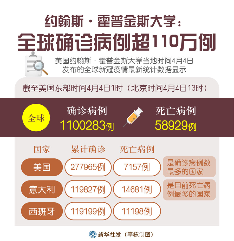 新華社華盛頓4月4日電 美國約翰斯·霍普金斯大學4日發(fā)布的全球新冠疫情最新統(tǒng)計數(shù)據(jù)顯示,全球累計確診病例數(shù)已超過110萬例。