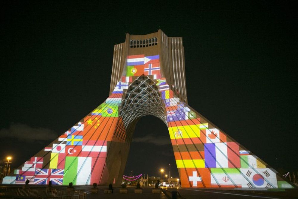 3月31日,伊朗首都德黑蘭地標(biāo)建筑自由塔上演燈光秀,為世界抗擊新冠肺炎疫情加油。新華社發(fā)(艾哈邁德·哈拉比薩斯 攝)