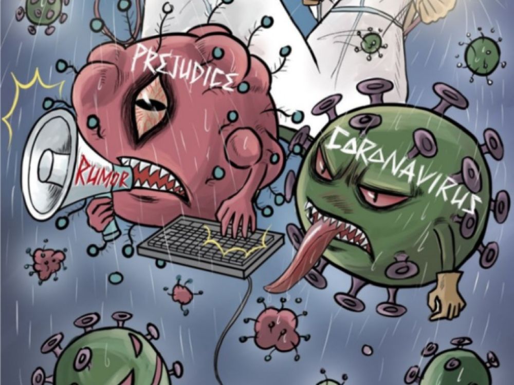 新華社2月29日在海外社交媒體平臺上播發(fā)以反對偏見和謠言為主題的“戰(zhàn)疫”漫畫。