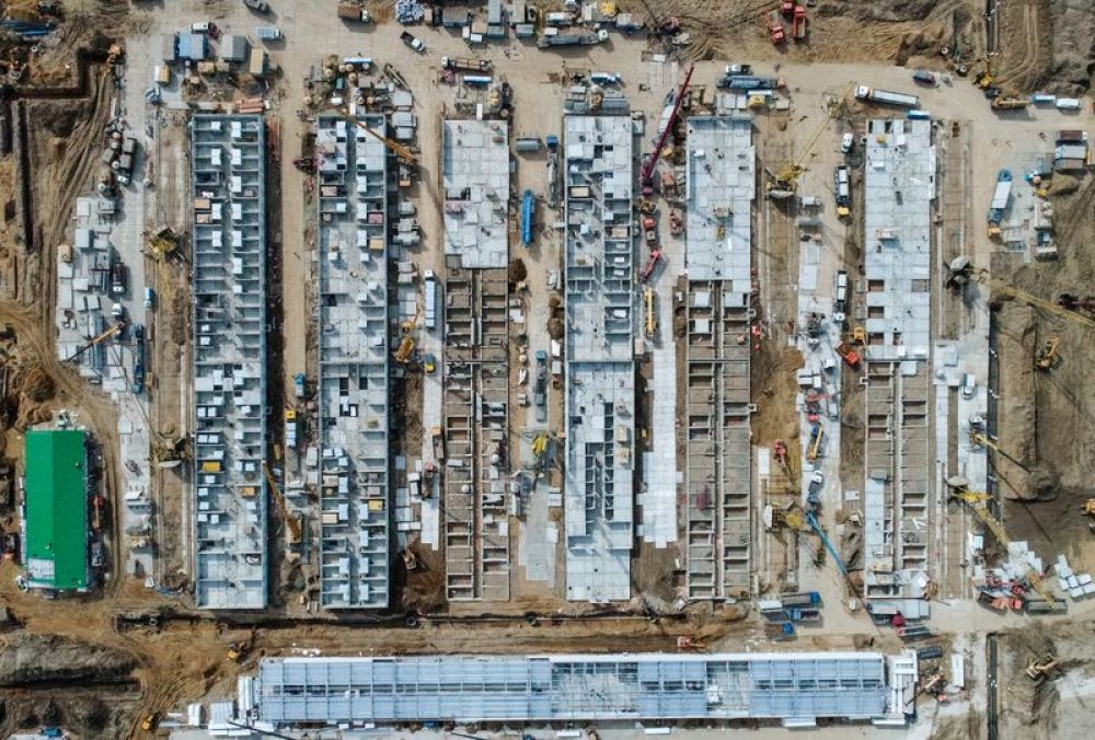 這是3月27日在俄羅斯首都莫斯科市郊拍攝的方艙醫(yī)院施工現(xiàn)場。新華社/衛(wèi)星社