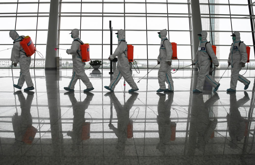 4月3日,在武漢天河機(jī)場,消防隊(duì)員進(jìn)入航站樓進(jìn)行消殺作業(yè)。新華社記者 程敏 攝