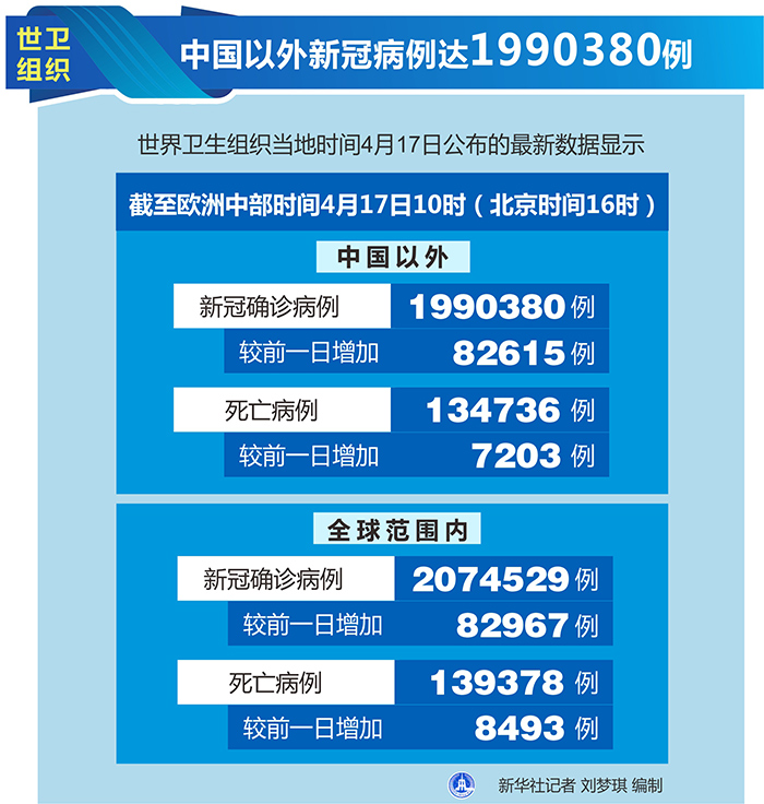 新華社日內(nèi)瓦4月17日電(記者劉曲)世界衛(wèi)生組織17日公布的最新數(shù)據(jù)顯示,中國(guó)以外新冠確診病例達(dá)到1990380例。